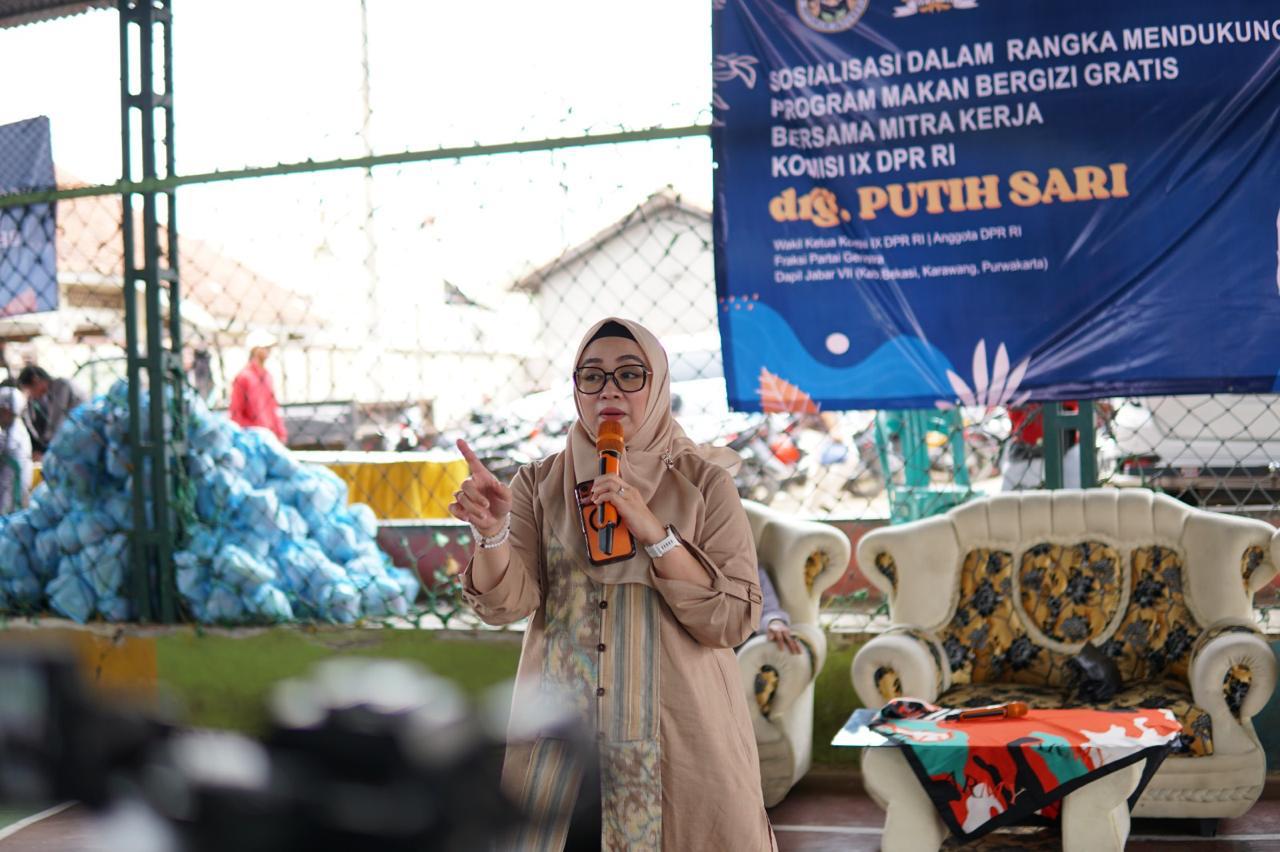 KABUPATEN BEKASI – Badan Gizi Nasional (BGN) terus melakukan sosialisai Makan Bergizi Gratis (MBG) bersama Komisi IX DPR yang diwakili oleh, Putih Sari, di Lapangan Futsal Pelangi, Telaga Murni, Kecamatan Cikarang Barat, Kabupaten Bekasi, Senin (02/03/2026).
